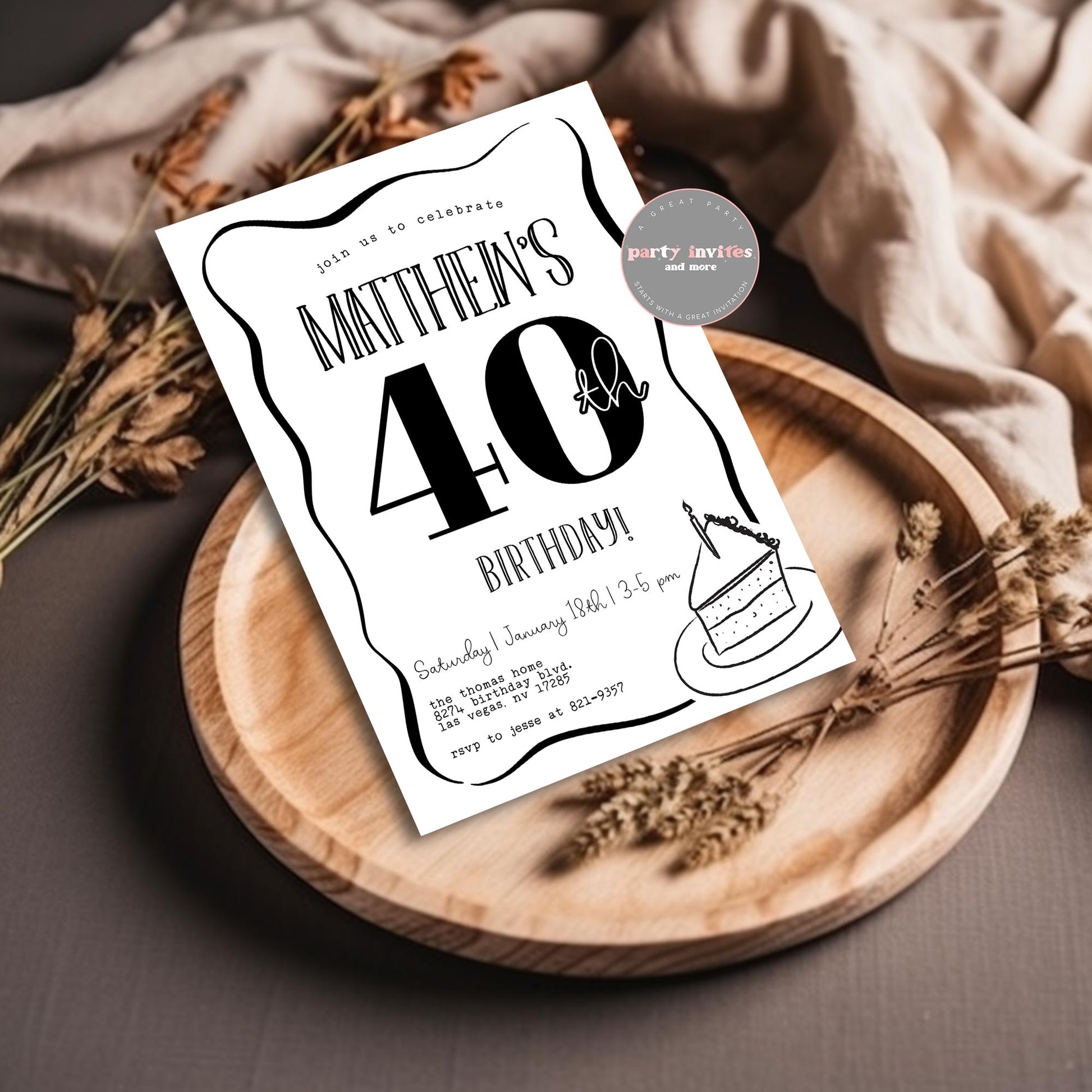Minimalist black and white themed birthday invitation with a hand drawn cake. Perfect for any age.